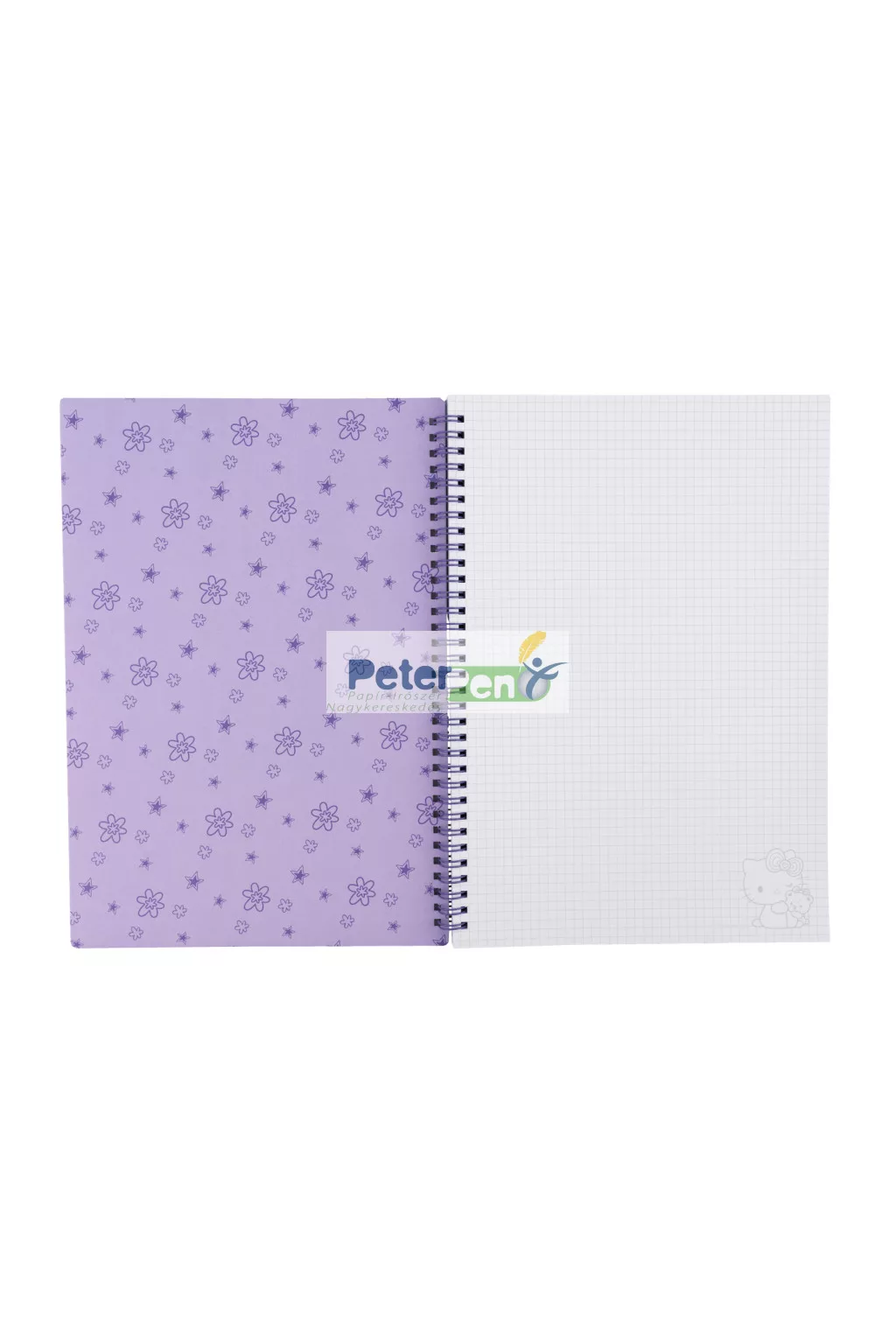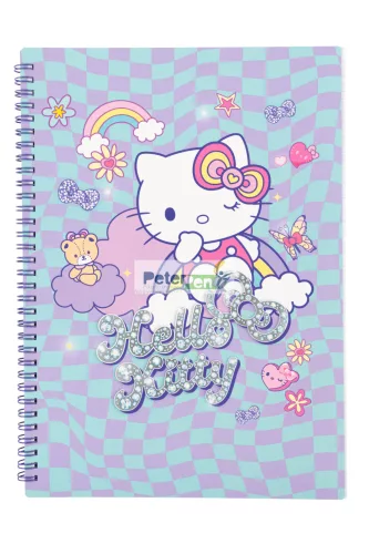 Vidám, Hello Kitty mintás spirálfüzet kockás lapokkal, ideális jegyzeteléshez iskolában vagy otthon.