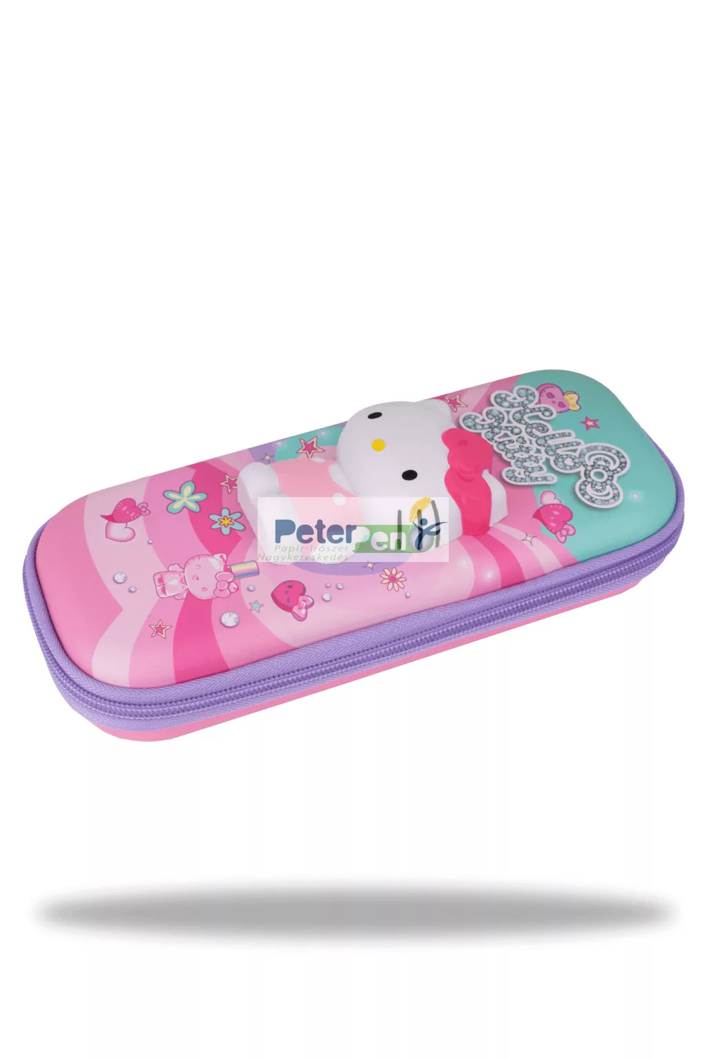 Stílusos és praktikus Hello Kitty mintás tolltartó, amely merev falú, keményfedeles kialakításának köszönhetően hatékony védelmet nyújt az írószerek számára. A fedélen található 3D szivacsos Hello Kitty figura különleges és vidám megjelenést biztosít.