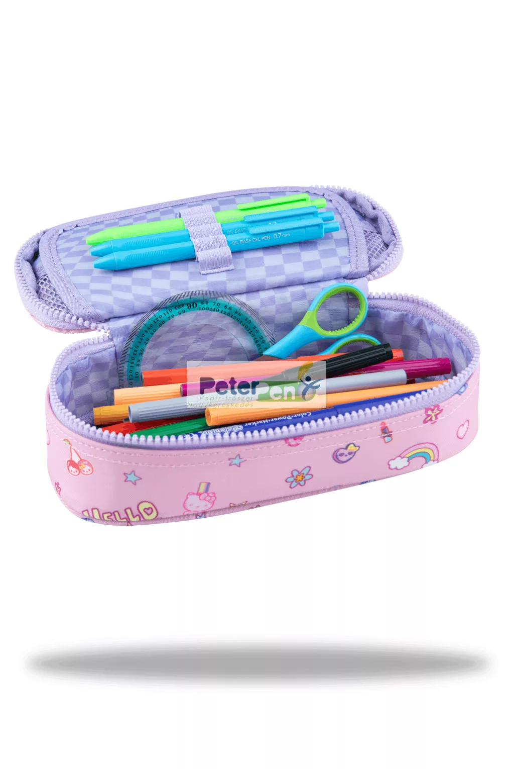 Vidám, Hello Kitty mintás bedobálós tolltartó, amely ideális választás az iskolai mindennapokra. Praktikus belső kialakításának köszönhetően könnyedén rendszerezhetők benne az írószerek: egy klapni ceruzatartó gumipántokkal, valamint egy zipzáras hálós zseb segíti a kisebb kiegészítők tárolását.