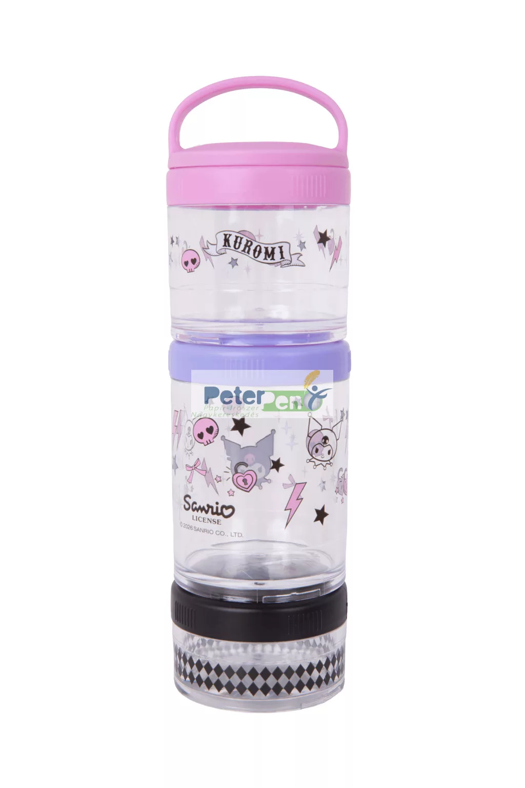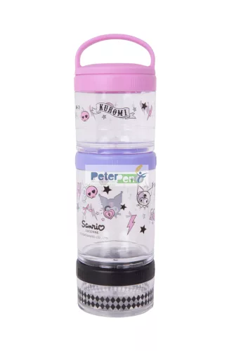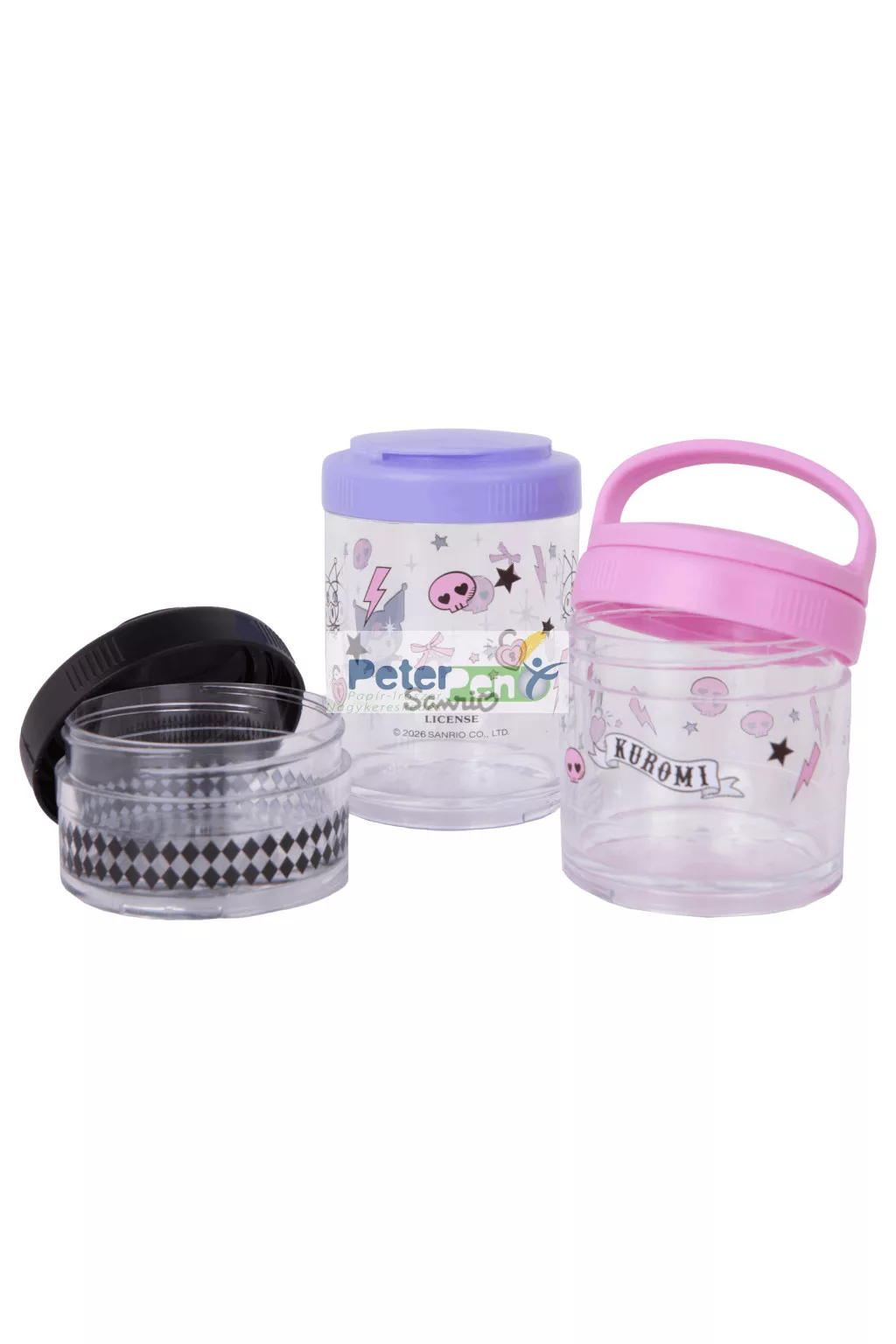 A Kuromi mintás háromrészes uzsonnás doboz praktikus és helytakarékos megoldás a mindennapi uzsonna tárolására. A pohár formájú, széttekerhető kialakításnak köszönhetően három külön rekeszben tarthatók az ételek, így azok elkülönítve, frissen és rendezetten vihetők magunkkal.
