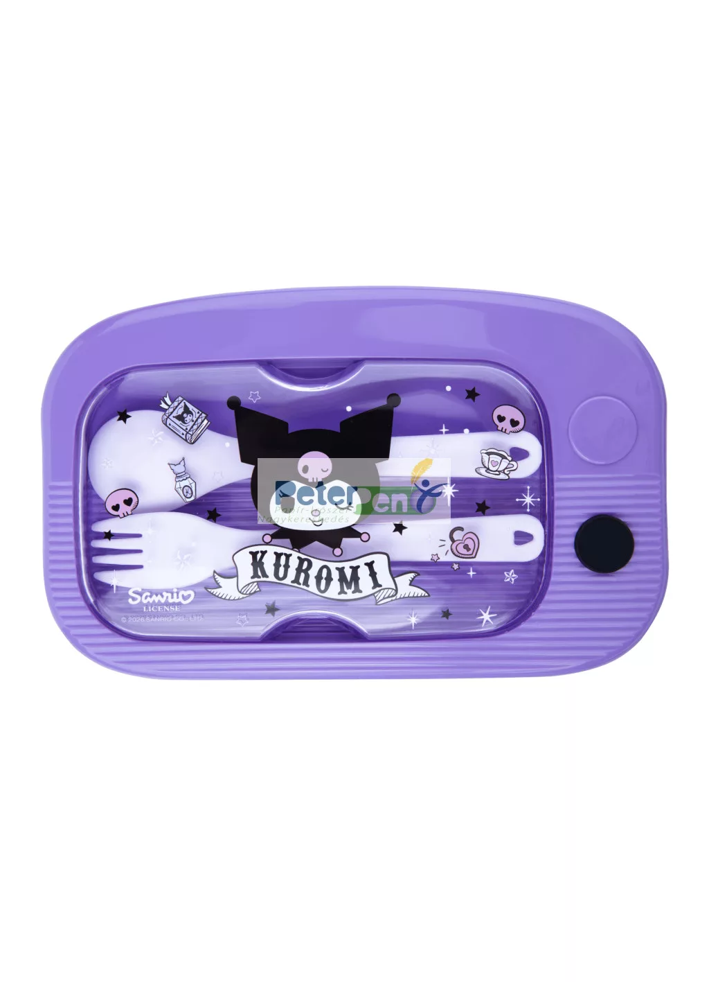 A Kuromi mintás MIL 1100 ml uzsonnás doboz praktikus és vidám választás a mindennapi étkezésekhez. A doboz tetején kialakított külön tartóban található az evőeszköz készlet, így minden egy helyen, rendezetten tárolható és könnyen használható.