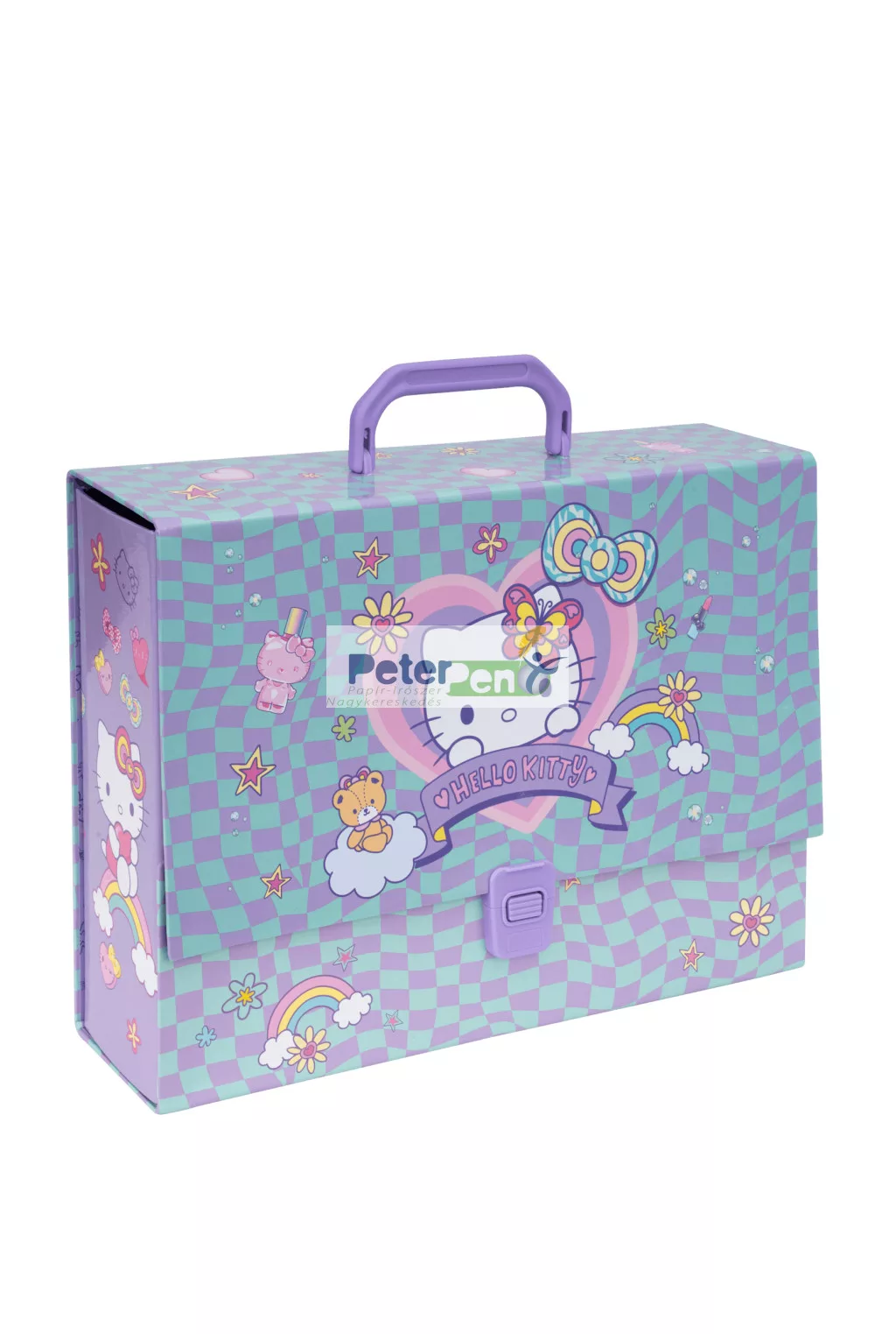 A Hello Kitty mintás 9 cm-es irattartó táska praktikus és strapabíró megoldás iskolai és irodai dokumentumok tárolására. A kemény karton anyag biztosítja a tartalom védelmét, így a lapok nem gyűrődnek és rendezetten tárolhatók.
