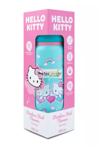 Stílusos és praktikus Hello Kitty mintás thermo kulacs, amely duplafalú fém kialakításának köszönhetően hosszabb ideig melegen vagy hidegen tartja az italokat. A 550 ml-es űrtartalom ideális iskolába, kirándulásokhoz vagy sportoláshoz.